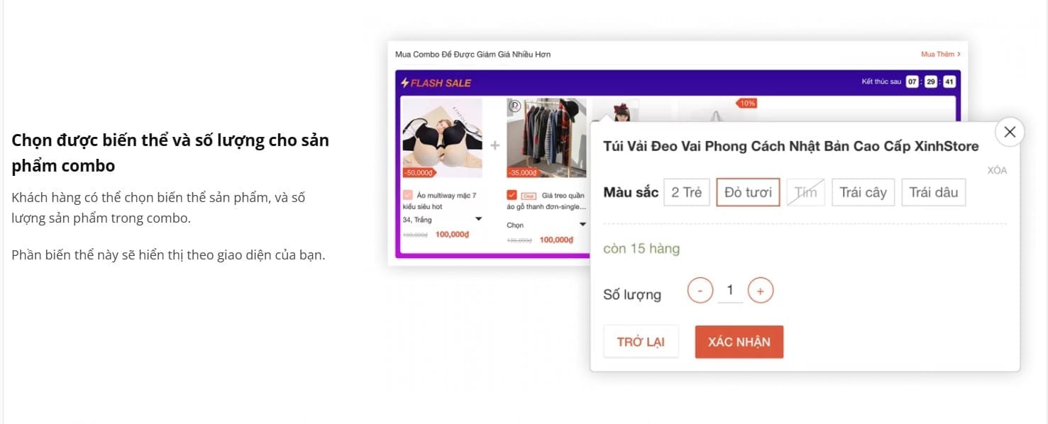 Với tính năng này, khách hàng có thể dễ dàng thêm vào giỏ hàng đúng sản phẩm họ mong muốn mà vẫn được hưởng ưu đãi giảm giá theo combo, tăng khả năng chốt đơn một cách hiệu quả.