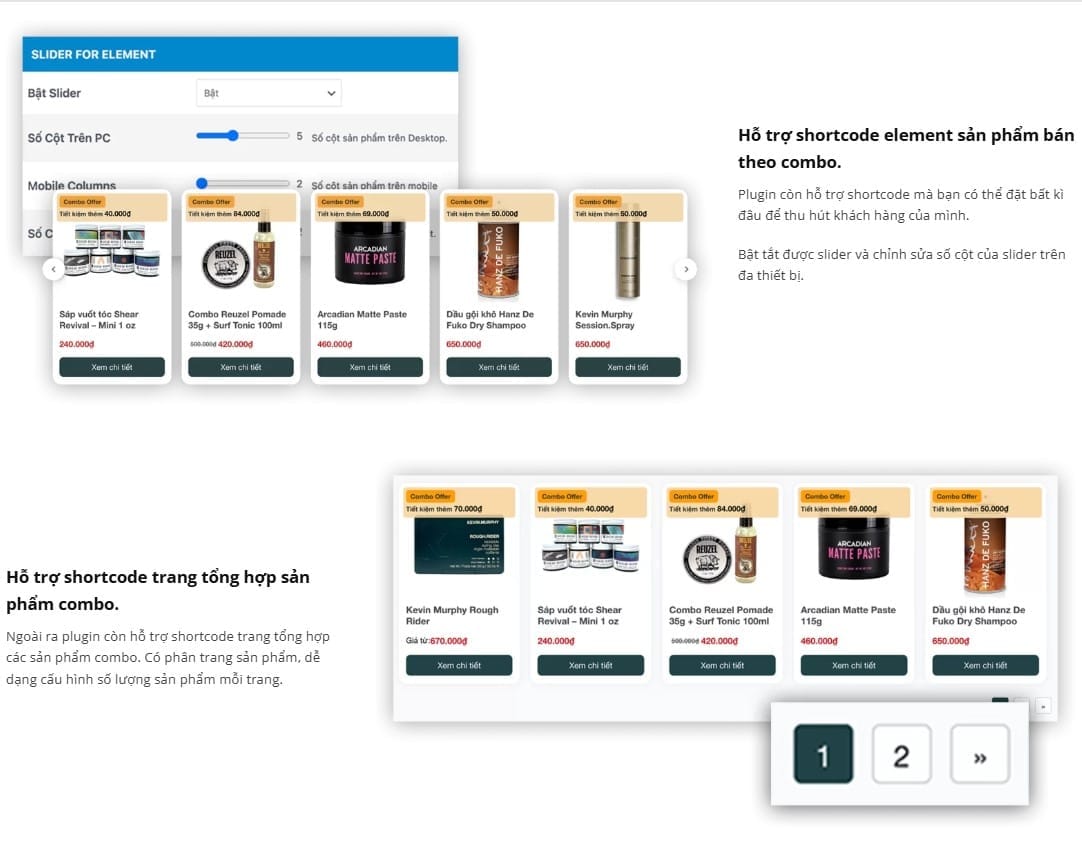 - Hỗ trợ shortcode WooCommerce, có thể hiển thị combo ở nhiều vị trí trên website.