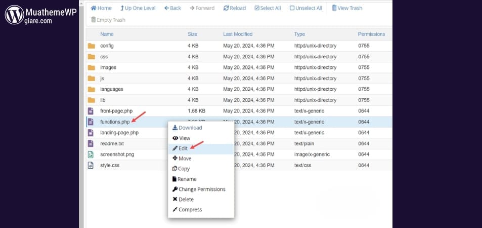 Bắt đầu bằng cách truy cập vào hosting thông qua File Manager của cPanel, DirectAdmin hoặc Plesk. Tìm đến thư mục chứa website, sau đó mở thư mục wp-content/themes/tên-theme/ và tìm file functions.php. Nếu đang sử dụng child theme, hãy chỉnh sửa file functions.php trong thư mục của child theme thay vì theme chính.
