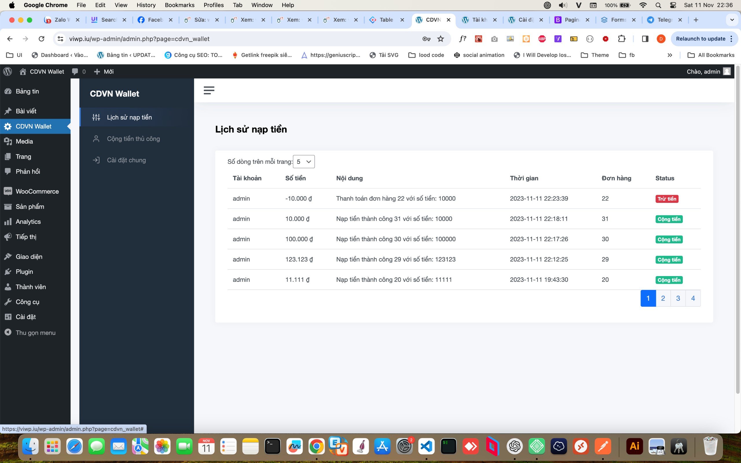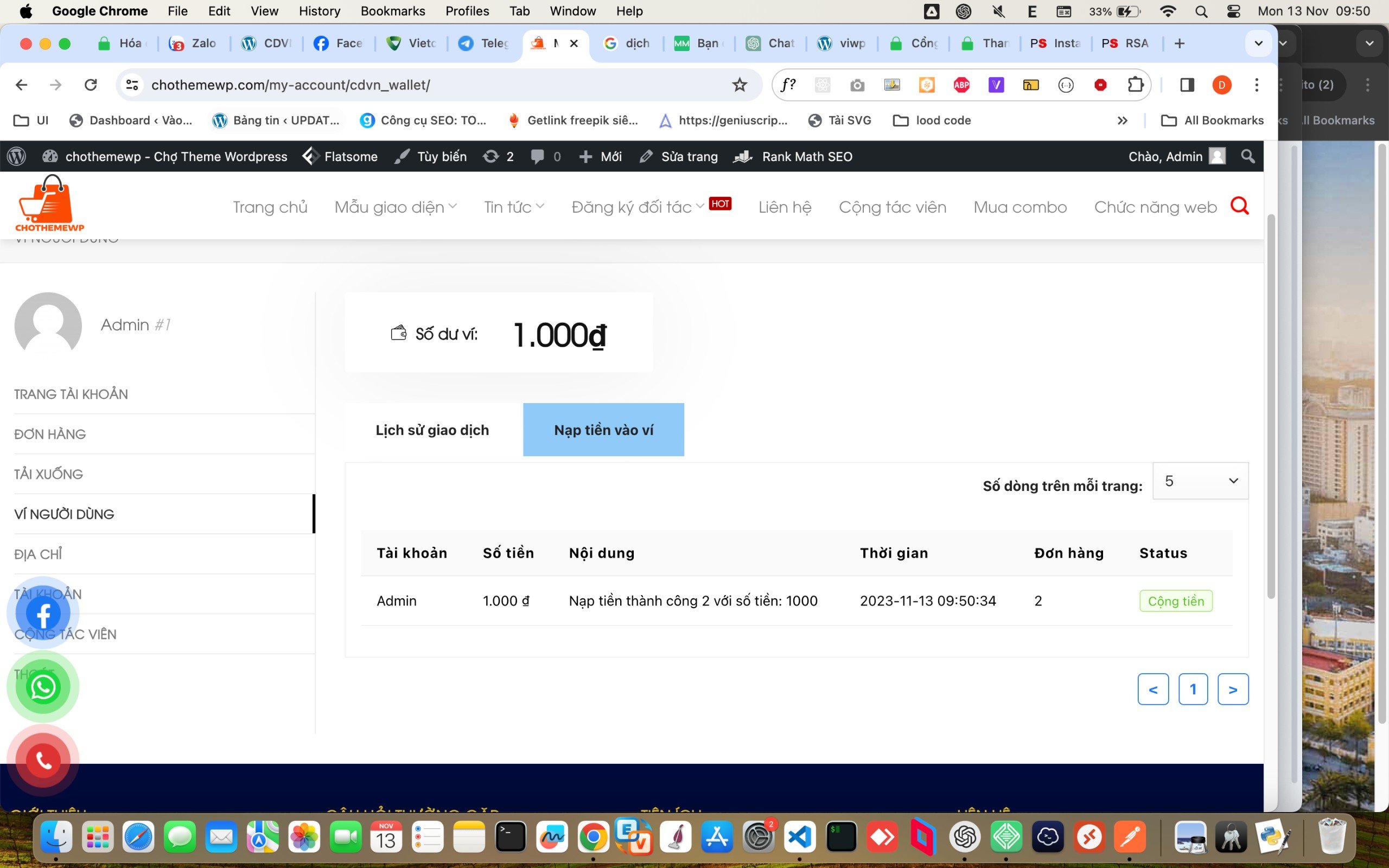 Ở phía quản trị, admin có thể theo dõi toàn bộ giao dịch của từng tài khoản, nạp tiền thủ công khi cần thiết và kiểm tra lịch sử hoạt động thông qua trang quản trị riêng.