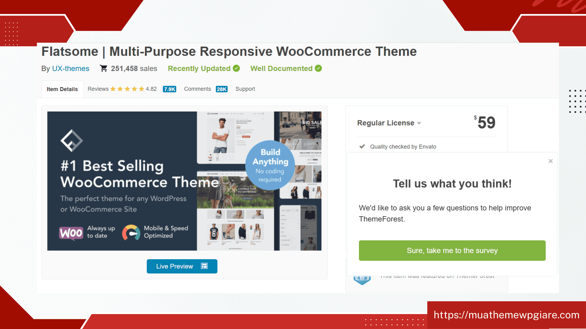 Flatsome được cung cấp trên nền tảng ThemeForest với hai lựa chọn bản quyền phù hợp với nhu cầu của từng đối tượng người dùng. Phiên bản phổ biến nhất là Regular License, có giá 59 USD, dành cho một website duy nhất. Gói này phù hợp với cá nhân, doanh nghiệp nhỏ hoặc những ai muốn xây dựng cửa hàng trực tuyến riêng mà không cần mở rộng quy mô lớn.
